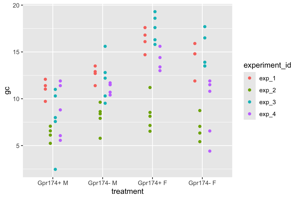 While this example is fake, I see this naive analysis a lot: tumor area of multiple tumors per mouse, islet area of multiple islets per mouse, number of vesicles docked to a membrane in multiple cells per mouse, the number of mitochondria in multiple cells per mouse, the number of neurites in multiple neurons in multiple cells per mouse, etc. etc. Indeed, when I’m looking for examples of pseudoreplication to teach, I just look for figures with a bunch of points per treatment – something similar to this plot of the fake data experiment. Regardless, this is a huge source of false discovery that could disappear overnight.