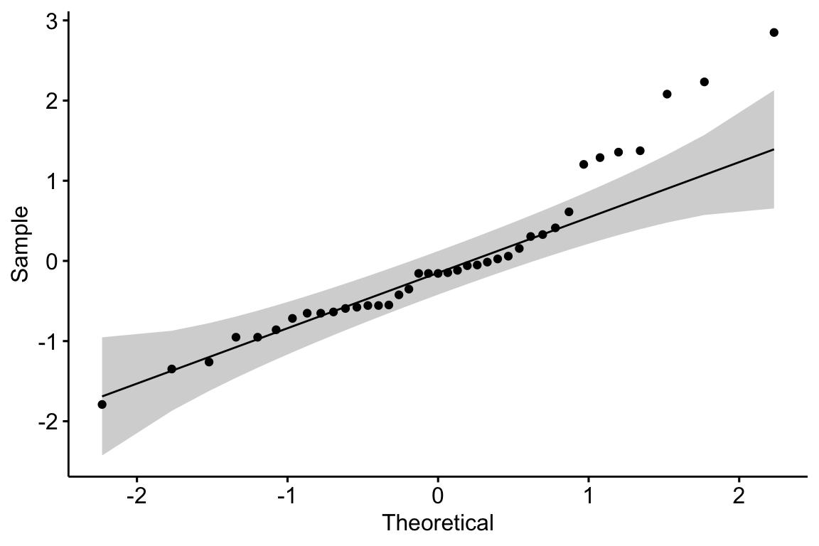 If the sampled distribution approximates a sample from a normal distribution, the scatter should fall along a line from the bottom, left to the top, right of the plot. The interpretation of a normal Q-Q plot is enhanced with a line of “expected values” of the sample quantiles if the sample residuals are drawn from a normal distribution. The closer the sample quantiles are to the line, the more closely the residuals approximate the expectation from a normal distribution. Because of sampling, the sampled values always deviate from the line, especially at the ends. The shaded gray area in the Q-Q plot in Figure ?? are the 95% confidence bands of the quantiles. A pattern of observed quantiles with some individual points outside of these boundaries indicates a sample that would be unusual if sampled from a Normal distribution.