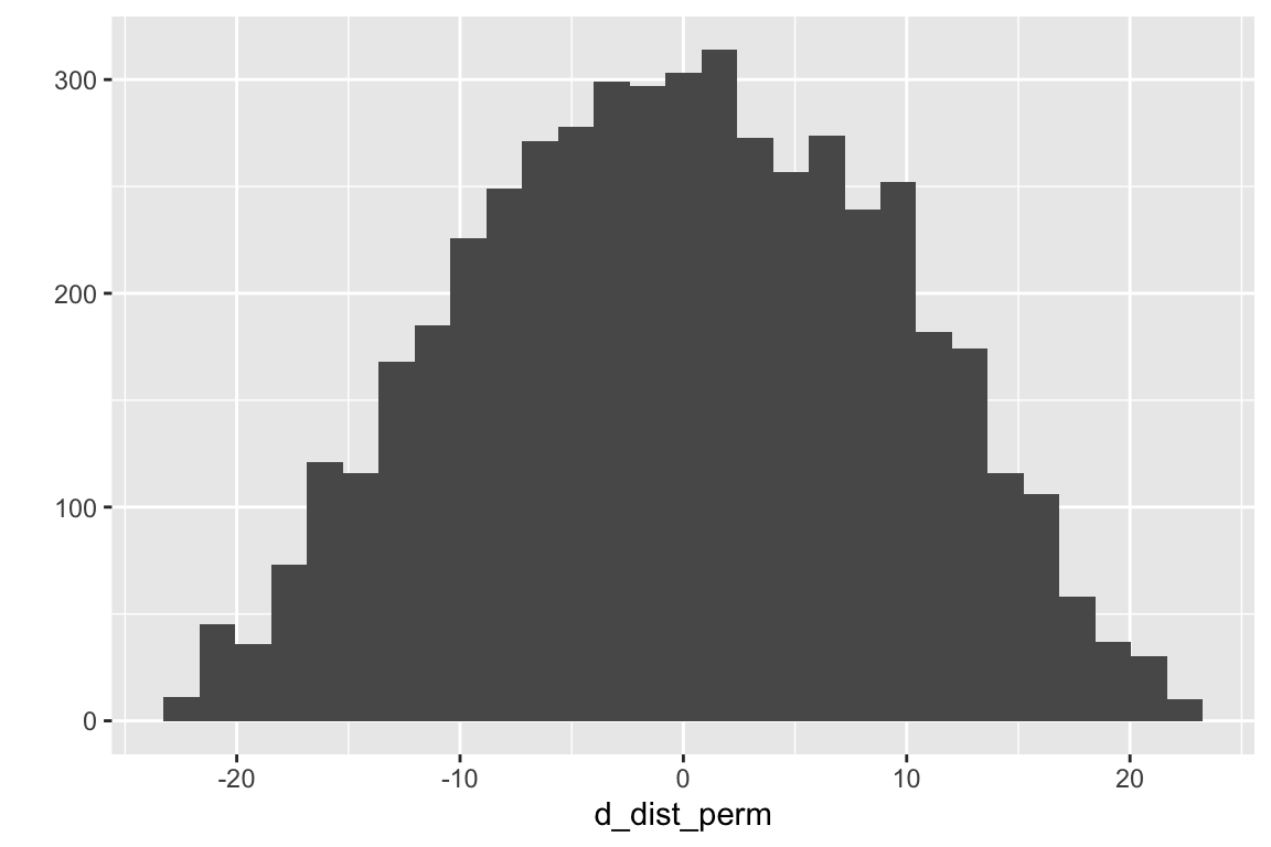 From this distribution of distances generated by random permuation of the response, we can compute a permutation p-value.